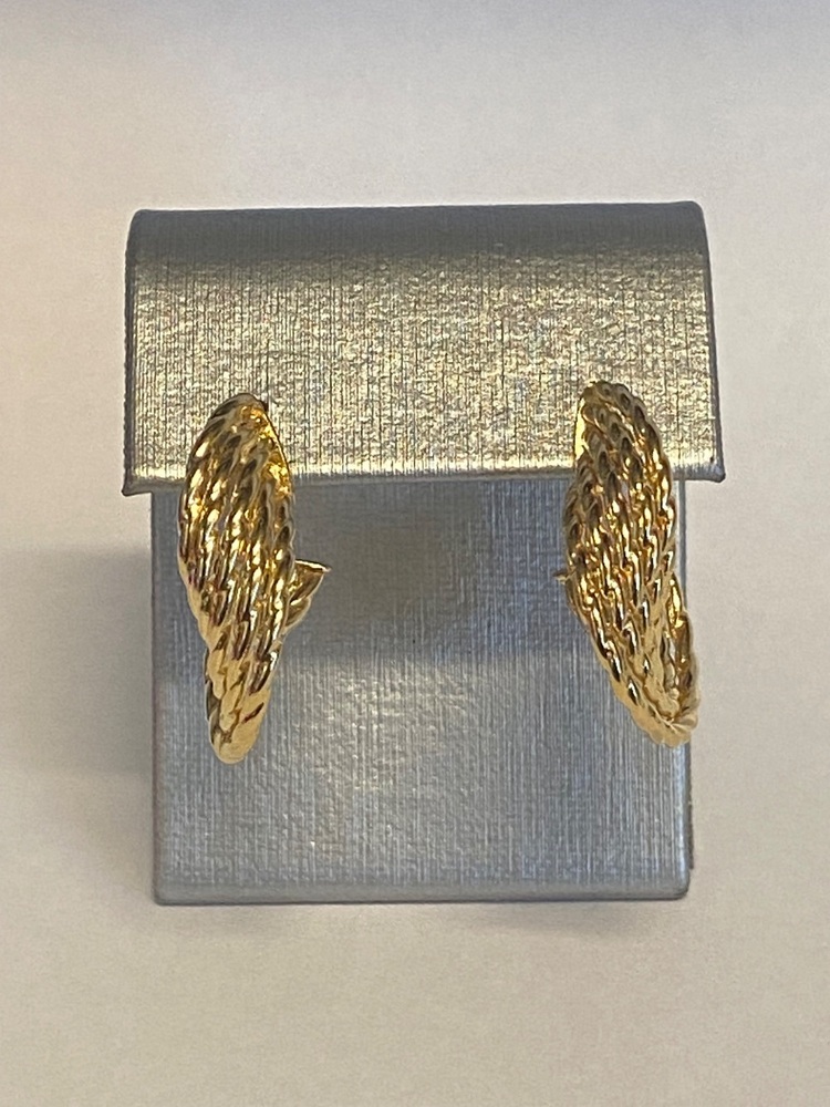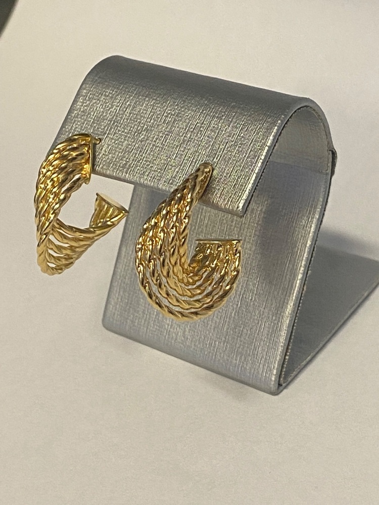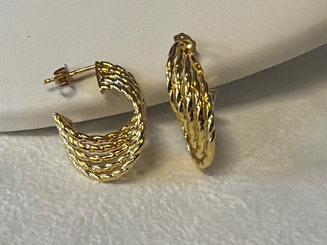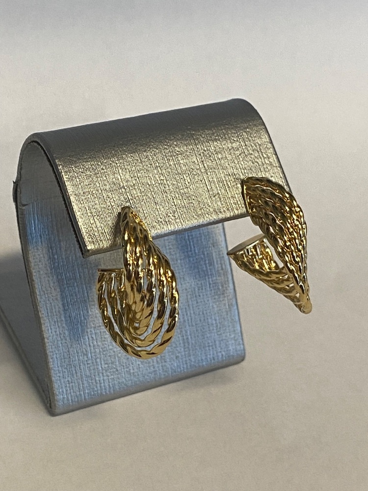 Whether paired with a chic daytime outfit or an elegant evening look, these hoops add a timeless touch of glamour. Their intricate pattern reflects light beautifully, giving the illusion of multiple golden ribbons dancing together.