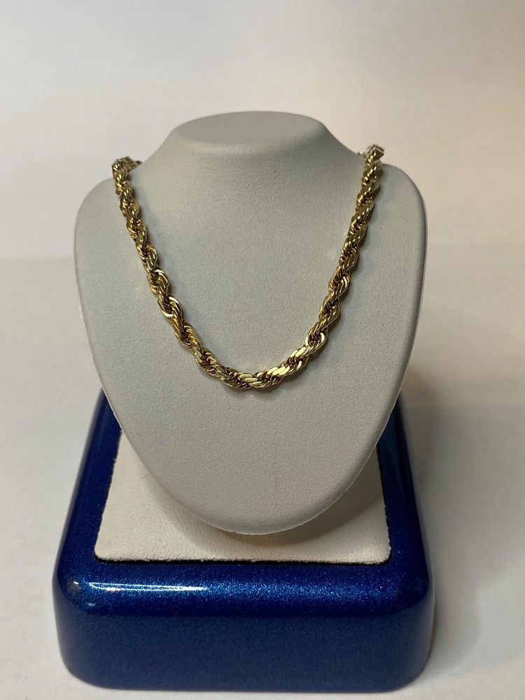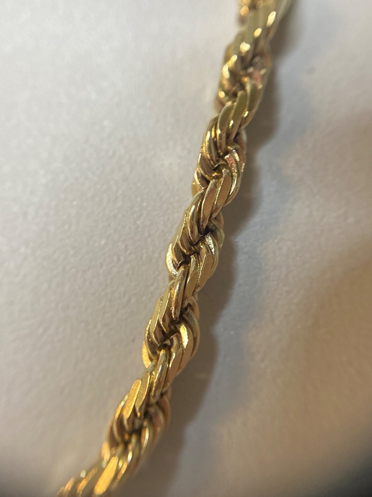 Elevate your everyday style with this striking 20" yellow gold rope chain. Crafted with a substantial 15.80 grams of rich gold weight, this chain delivers a bold presence while maintaining a smooth, comfortable feel. The 2.3mm rope design offers brilliant light-catching texture and timeless appeal, making it an effortless match for both stand-alone wear and pairing with your favorite pendant. Finished with a secure lobster clasp for dependable, daily use.