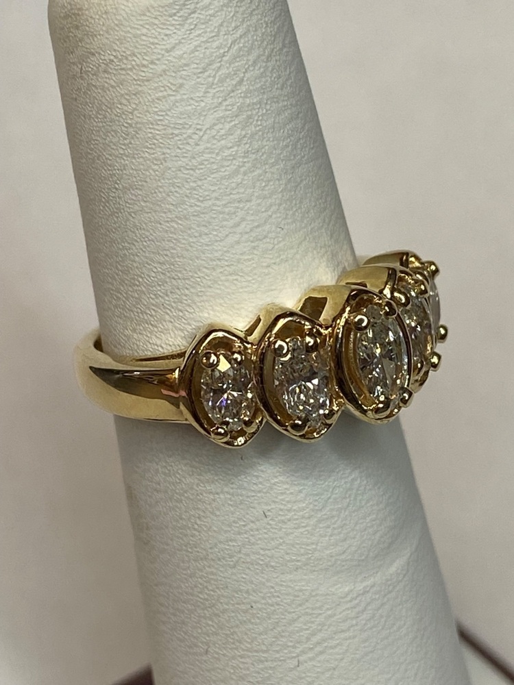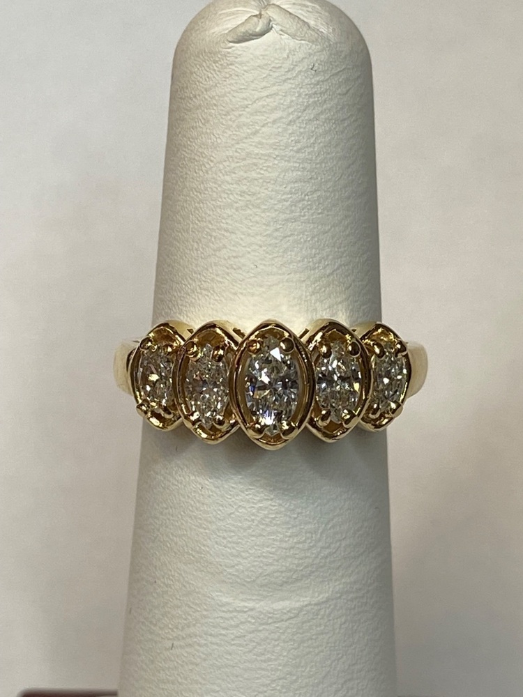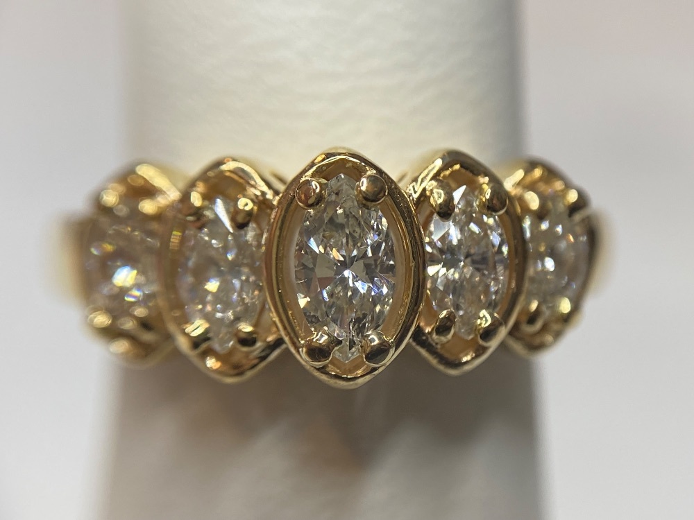 Elegant, bright, and beautifully timeless, this 14K yellow gold ring features five marquise-cut diamonds totaling approximately 1.00 carat. Each diamond is expertly prong set, forming a graceful row of shimmering brilliance. Surrounding the stones is a delicate gold halo-style frame, adding warmth, dimension, and a refined vintage-inspired touch.