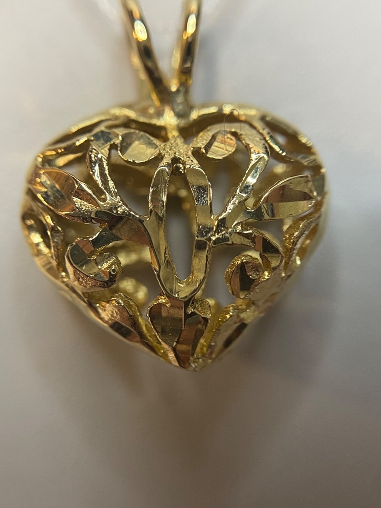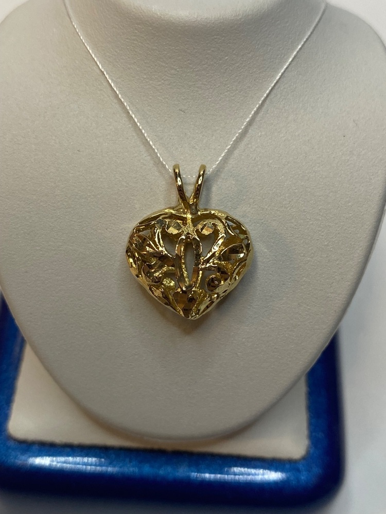This beautiful 14K yellow gold filigree heart pendant (2.20g) features an intricate openwork design that gives it a delicate, vintage-inspired look. The hollow construction keeps the pendant lightweight and comfortable, while the detailed filigree scrollwork creates a soft, romantic aesthetic that catches the light from all angles.