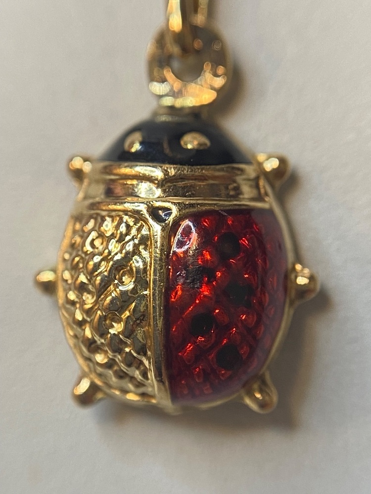 This adorable 14K yellow gold ladybug pendant (1.30g) features bright red and black enamel detailing on one side, giving it a charming, lifelike look. The rich gold body adds warmth and shine, while the enamel wings create a pop of playful color that stands out beautifully.