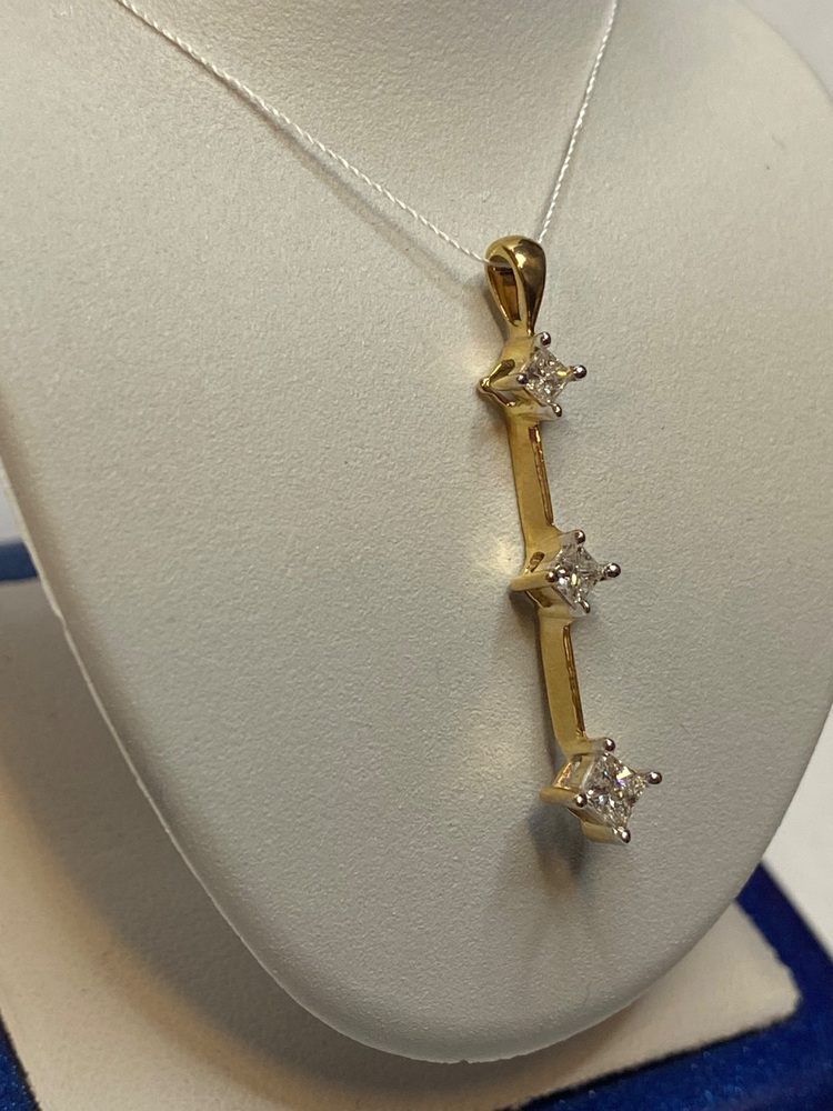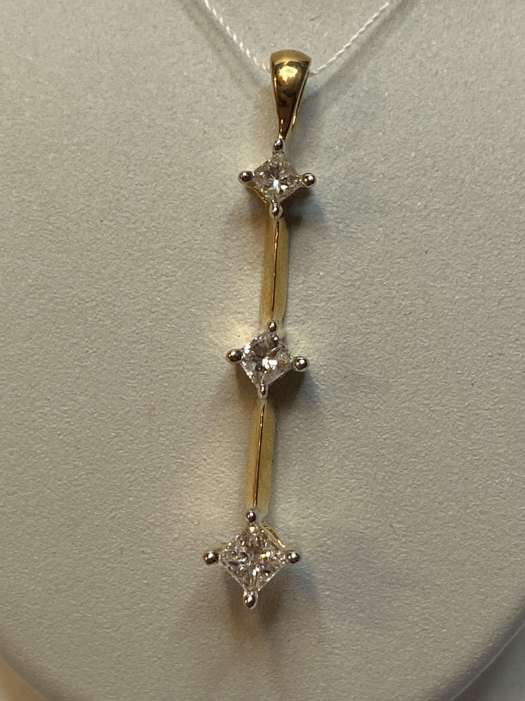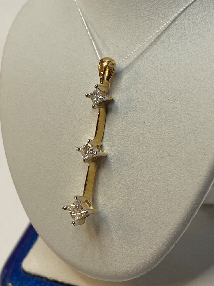 This sophisticated 14K yellow gold pendant (0.90g) features a sleek, linear arrangement of three princess-cut diamonds, totaling .33ctw. Each diamond is separated by a polished gold bar, giving the design a clean, modern look while highlighting the brilliance and symmetry of each stone.