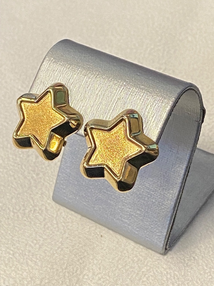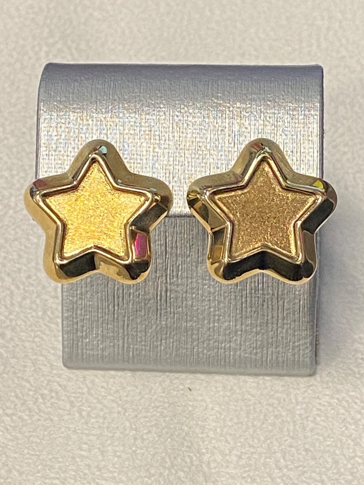 These stunning 18K yellow gold star earrings combine playful charm with refined craftsmanship. Each earring features a raised polished star outline surrounding a softly brushed center, creating a beautiful contrast of texture and shine. The solid gold design gives them a luxurious weight and feel, while the flip-back posts ensure a secure and comfortable fit. A bold yet elegant statement piece for any jewelry collection.