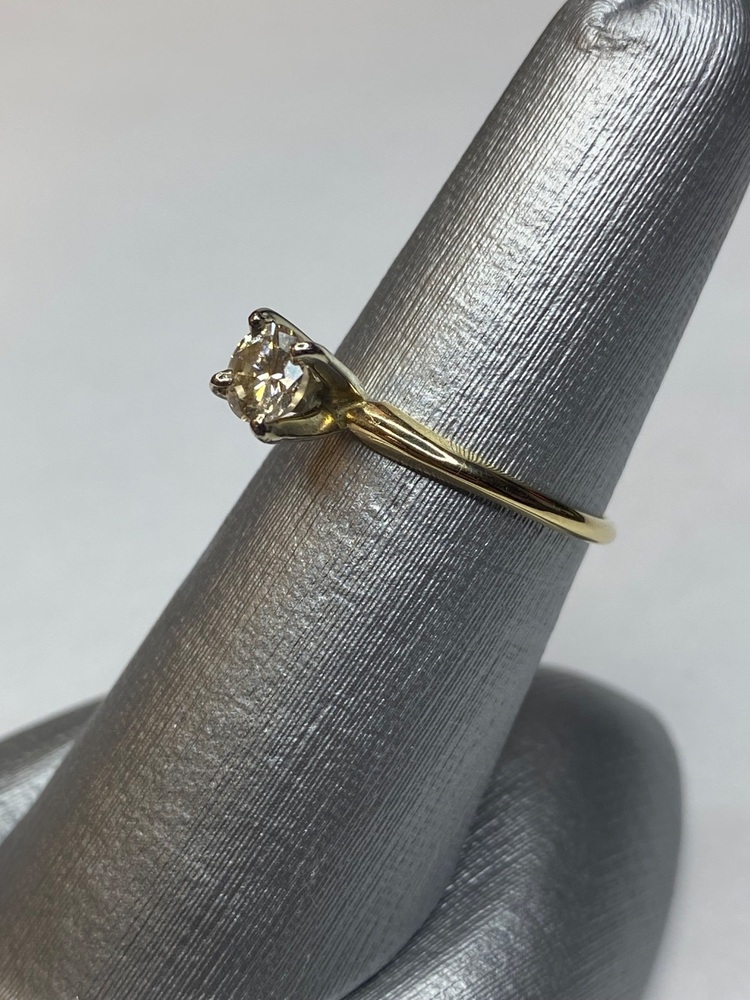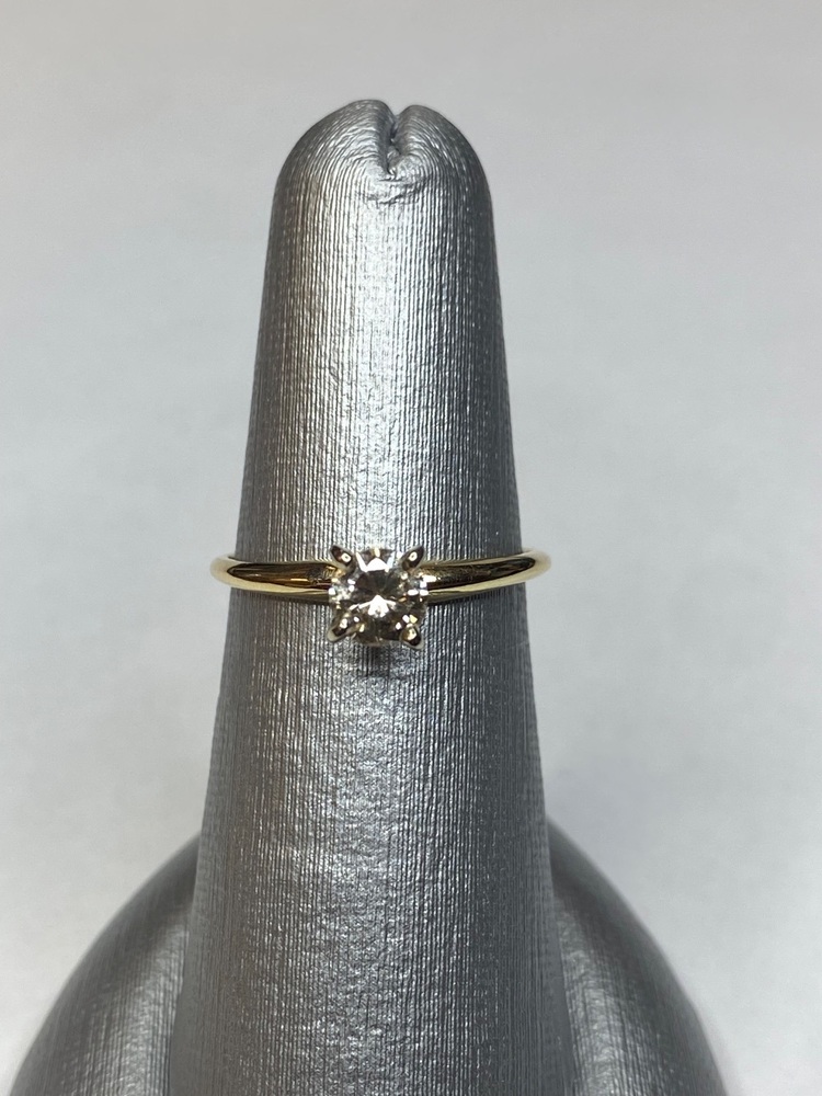 This classic solitaire ring showcases a beautiful .50 carat diamond set in a timeless Tiffany®-style setting, designed to elevate the stone and maximize light from every angle. Crafted in rich 14KT yellow gold, the warm tone of the band creates a striking contrast against the diamond’s natural sparkle.