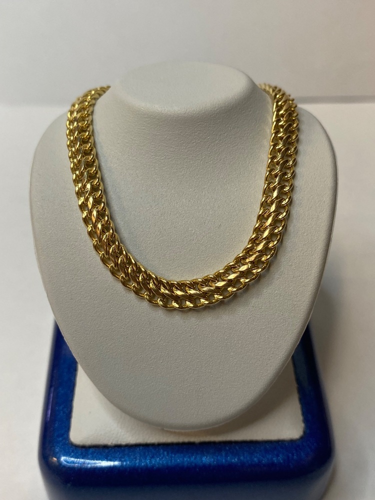 The double Cuban pattern adds visual texture and catches the light beautifully, making this chain a standout piece whether worn alone or paired with a pendant. Its sturdy construction and classic gold tone ensure long-lasting wear and timeless appeal.