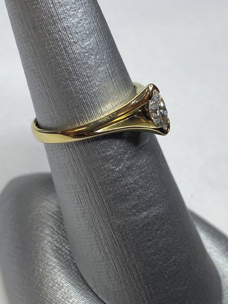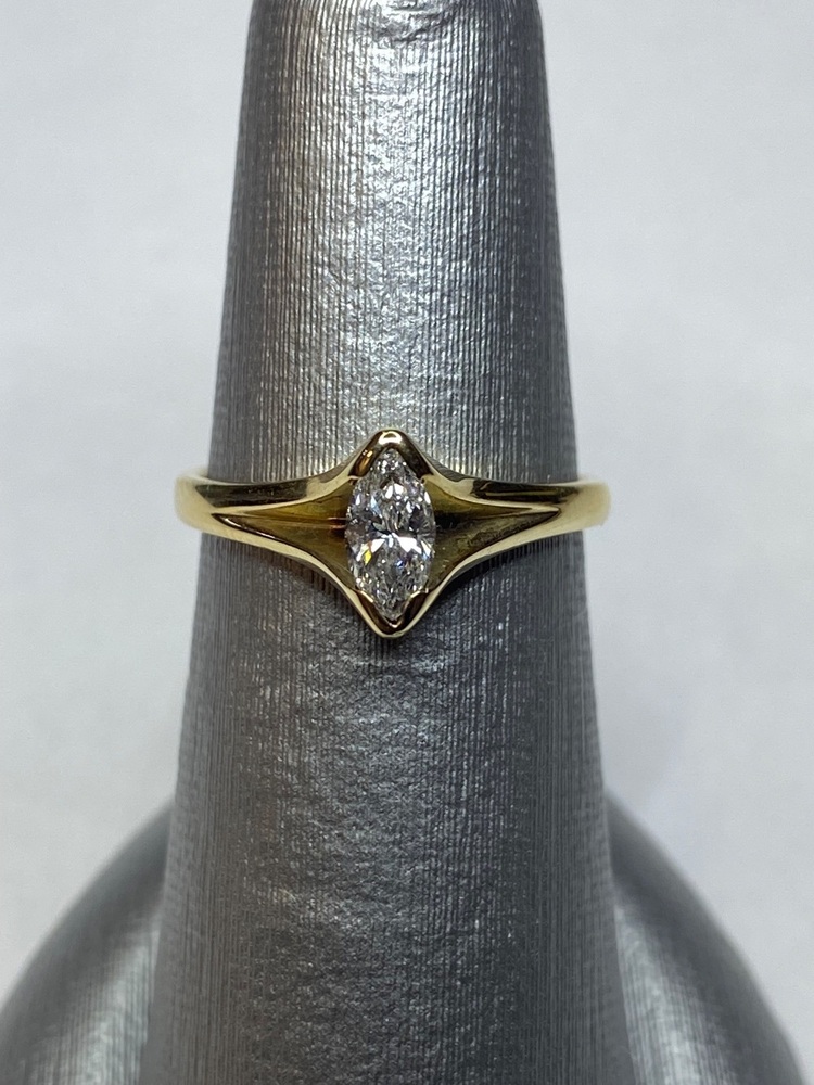 Elevate your jewelry collection with this stunning 14kt yellow gold Marquee Solitaire ring. Expertly crafted, it features a brilliant 0.33ct diamond securely held in a tension setting, allowing light to reflect beautifully from every angle. The marquee-shaped design adds a touch of timeless elegance, while the sleek band offers a modern flair.