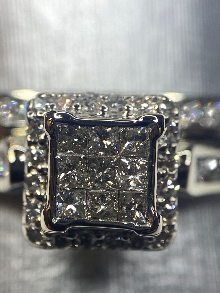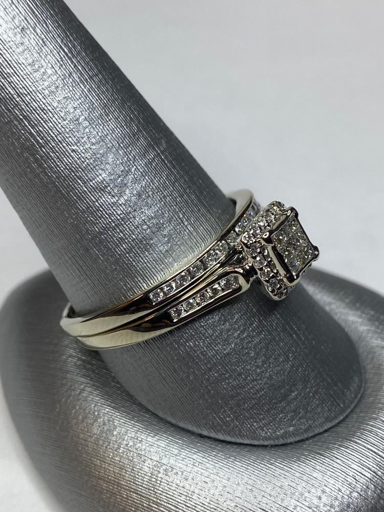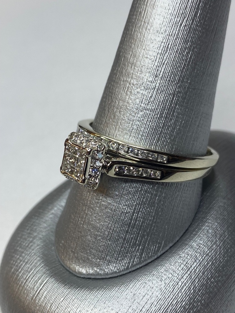 This beautiful 10kt white gold wedding set features a striking princess-style illusion center composed of nine diamonds, designed to create the appearance of a larger single stone. The illusion setting offers maximum sparkle while maintaining a classic, elegant silhouette.