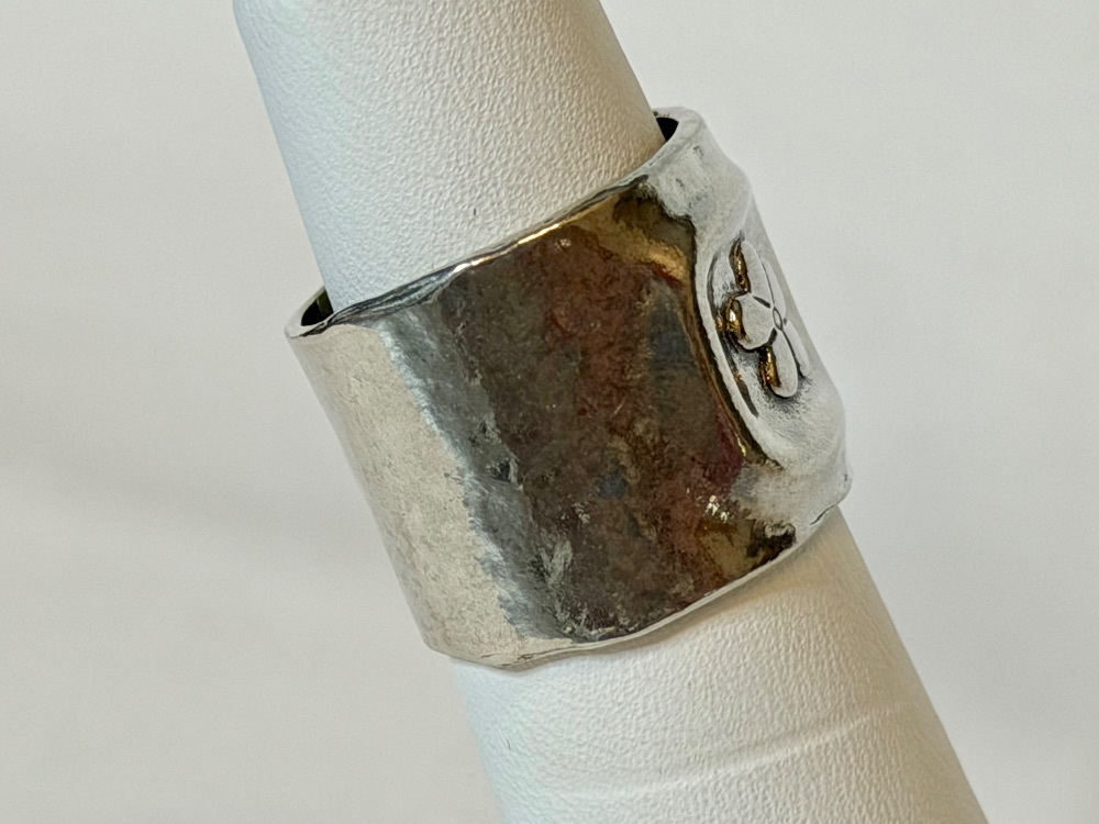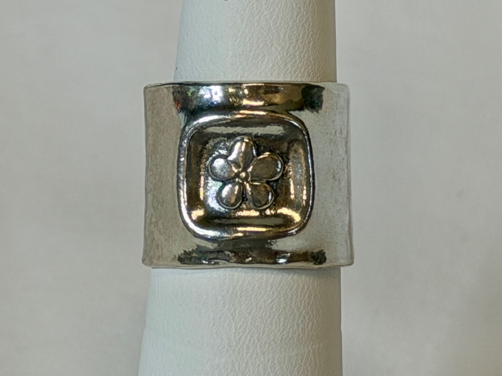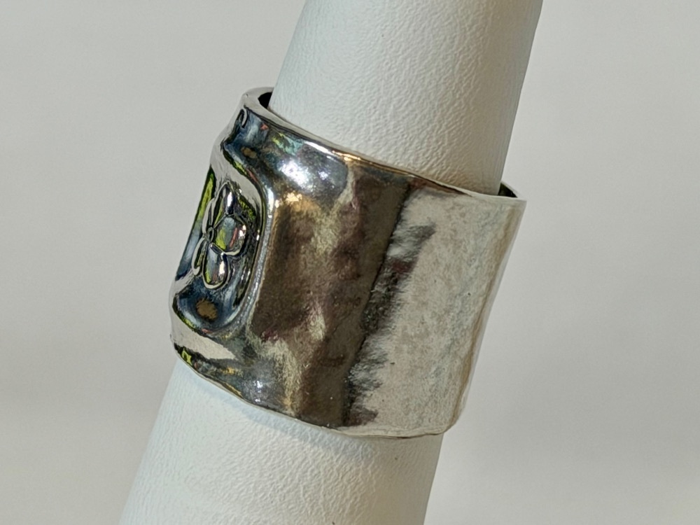 Bold, stylish, and full of character, this chunky sterling silver ring showcases a beautifully stamped flower motif across a solid wide band. Crafted at a substantial 8.30 grams, it has a strong, quality feel while still being comfortable for everyday wear. The floral design adds a touch of artistry and vintage charm, making it a standout piece for anyone who loves unique silver jewelry.