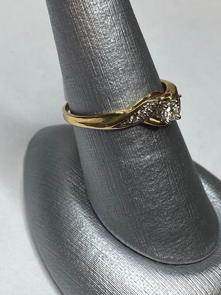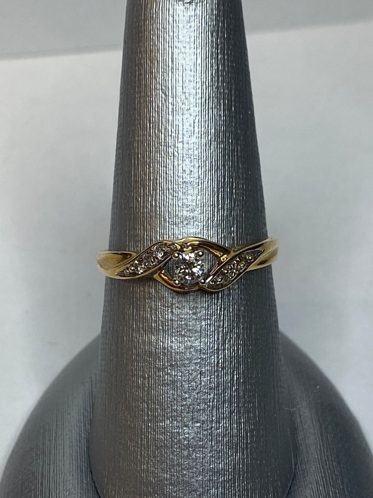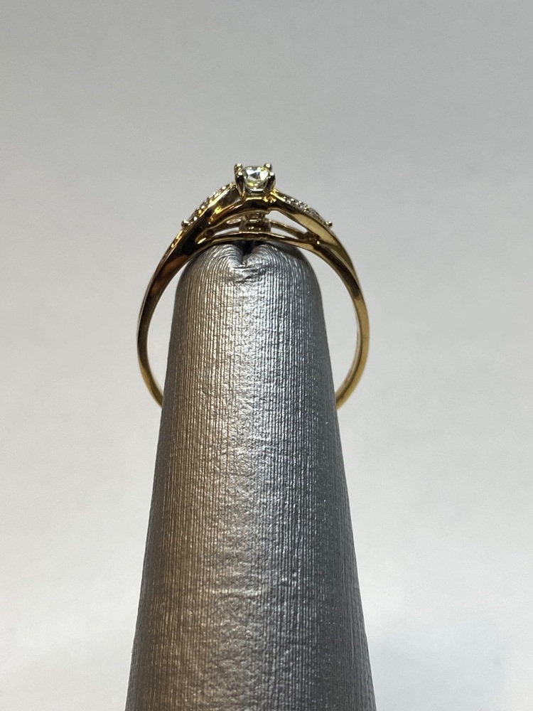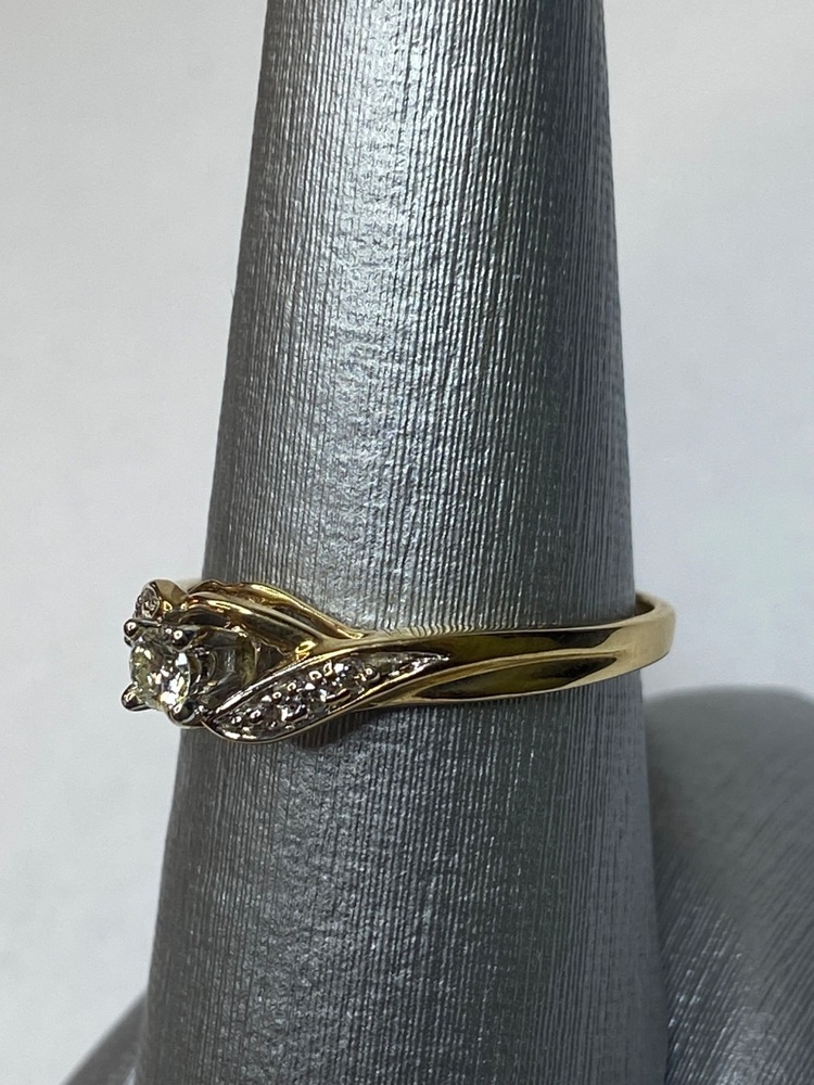 Crafted in warm 10kt yellow gold, this elegant ring features a beautifully designed cathedral setting with accent diamonds that gracefully swirl above and below the center stone, creating a fluid, eye-catching look. The thoughtful design adds movement and dimension while maintaining a refined, balanced profile.