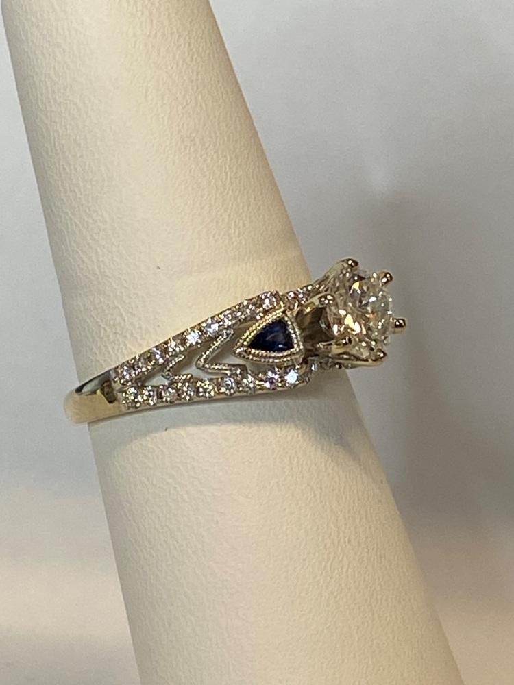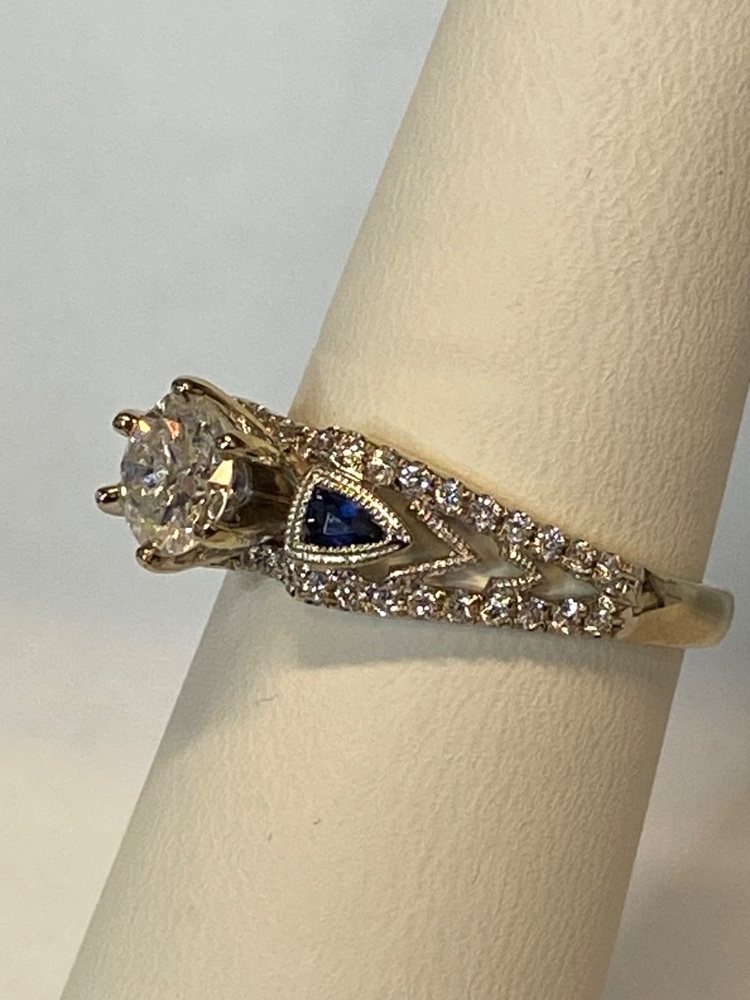 Timeless beauty meets romantic elegance in this stunning vintage 14K gold ring. At its center shines a brilliant .71ct round diamond, full of fire and character. Framing the diamond are two deep blue trillion-cut sapphires, positioned like elegant wings that add contrast, depth, and a touch of mystery to the design.