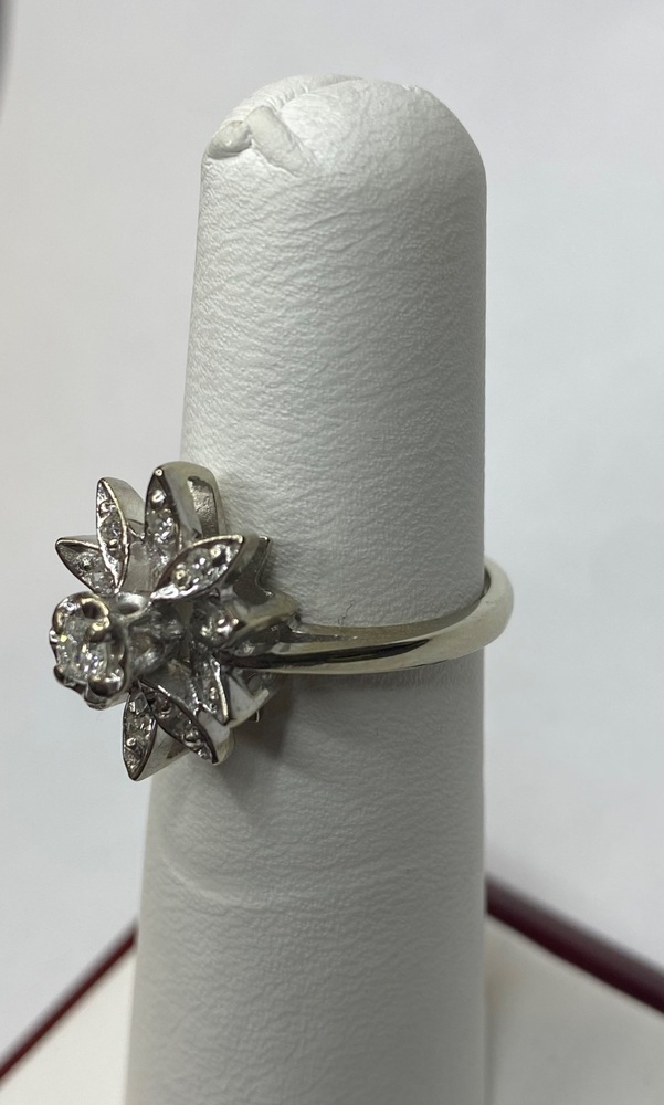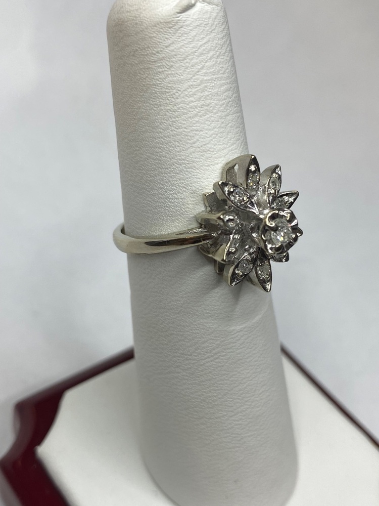 This enchanting 14K white gold ring blends delicate elegance with timeless vintage character. At its center rests a sparkling .10ct round diamond, surrounded by ten finely set diamond “petals” that create a soft, blooming floral motif. With a total of .30ctw, the diamonds catch the light beautifully, giving the ring a graceful radiance from every angle.